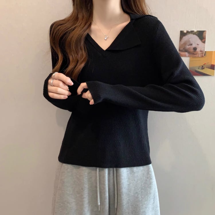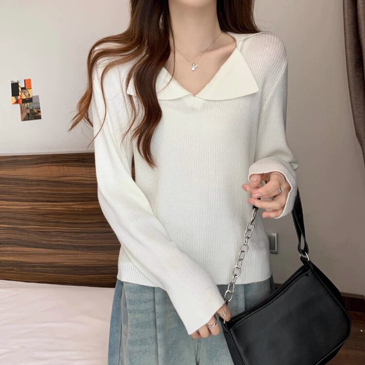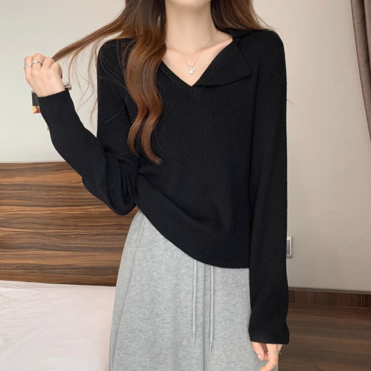 カラー切り替えポロ襟ニット長袖トップス A10003
