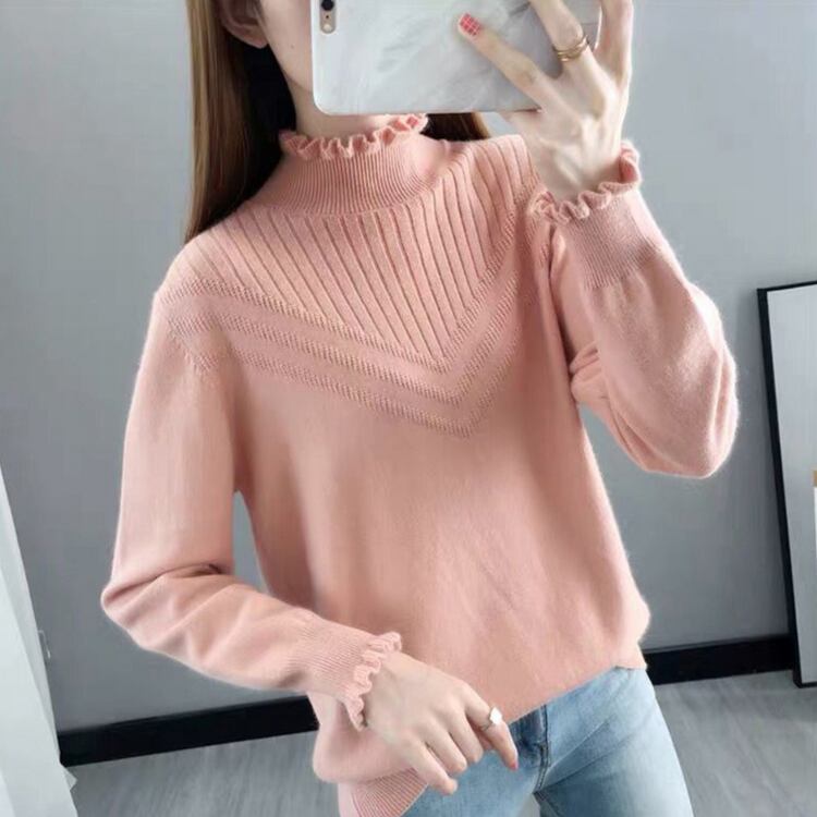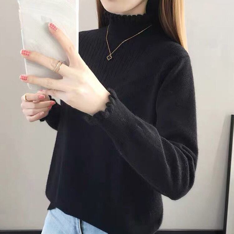 ふんわり柔らかな肌触りで、首元と袖口に施されたフリルが女性らしい印象をプラスするニットトップス。