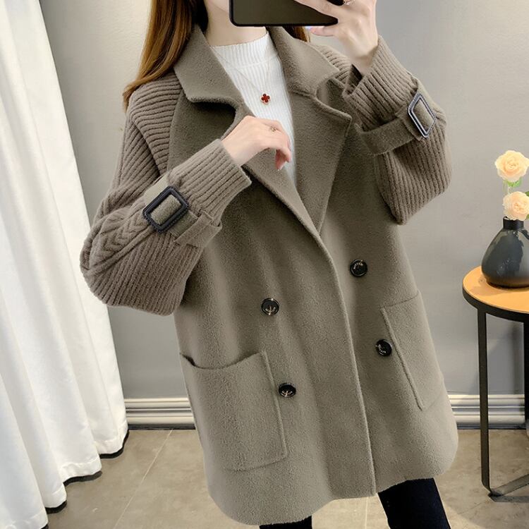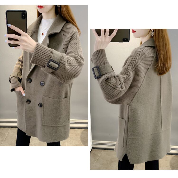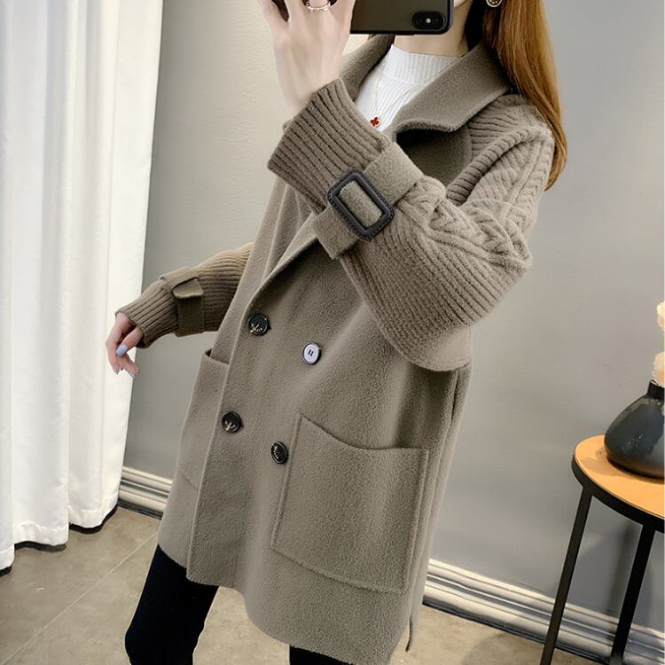 レディースコート 異素材切替 ダブルボタン 中厚手 ミディアム丈 ゆったり 韓国風アウターA10034